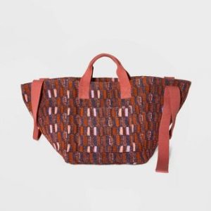 Handbag with a cotton shell and a crocheted or beaded exterior. One main compartment and an interior slip pocket. Closes with a complementing flap featuring a magnetic snap fastening. Matching sling strap completes the design with easy carrying convenience.